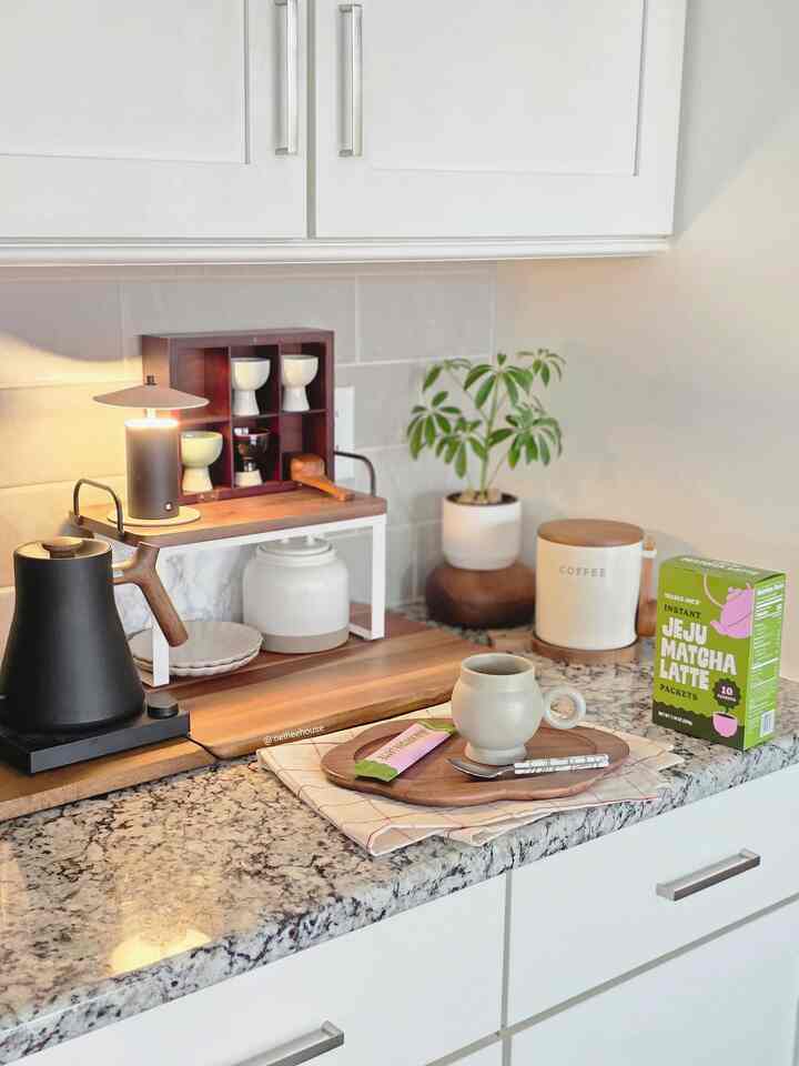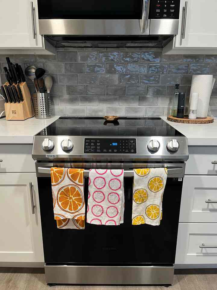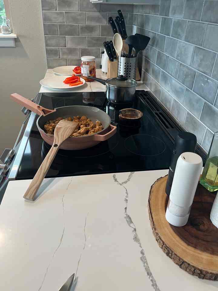 This may not be the most aesthetic picture, but it’s real life! And it showcases how my kitchen may not be the biggest, but it’s functional! I keep everything I need within an arms reach of my stovetop for efficiency and functionality. As I’m cooking, I can easily grab the salt & pepper, spatula, oil, paper towels…you name it!