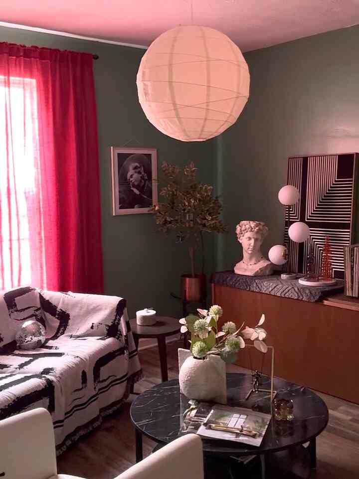 I think its a very nice view of my new living room in the house i live in now. The red curtains will be switched out for another color because there are times when they dont look good in this room. It depends on lighting conditions. But this is a lovely view. Dont you think? #livingroom #house #red #green #color