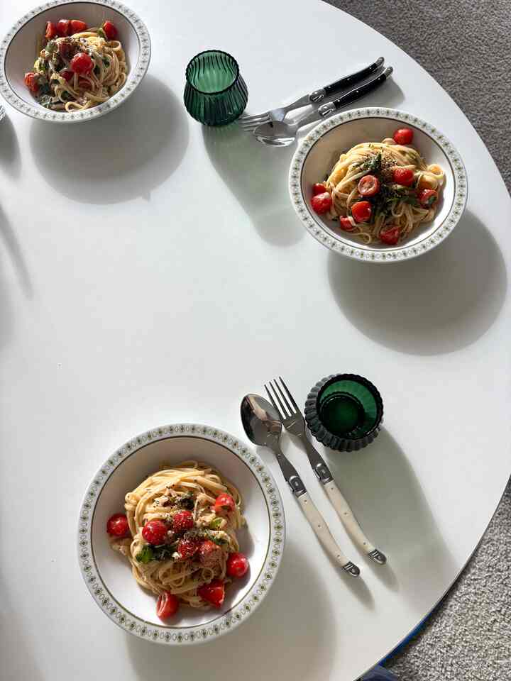 🍝 Homemade pasta Just boil the noodles, then toss them with basil, tomatoes, minced garlic, brie cheese, and olive oil — that’s it. A super easy, no-heat pasta recipe! #pasta #recipe #plate #luchtable #roundtable #tableware #cutlery