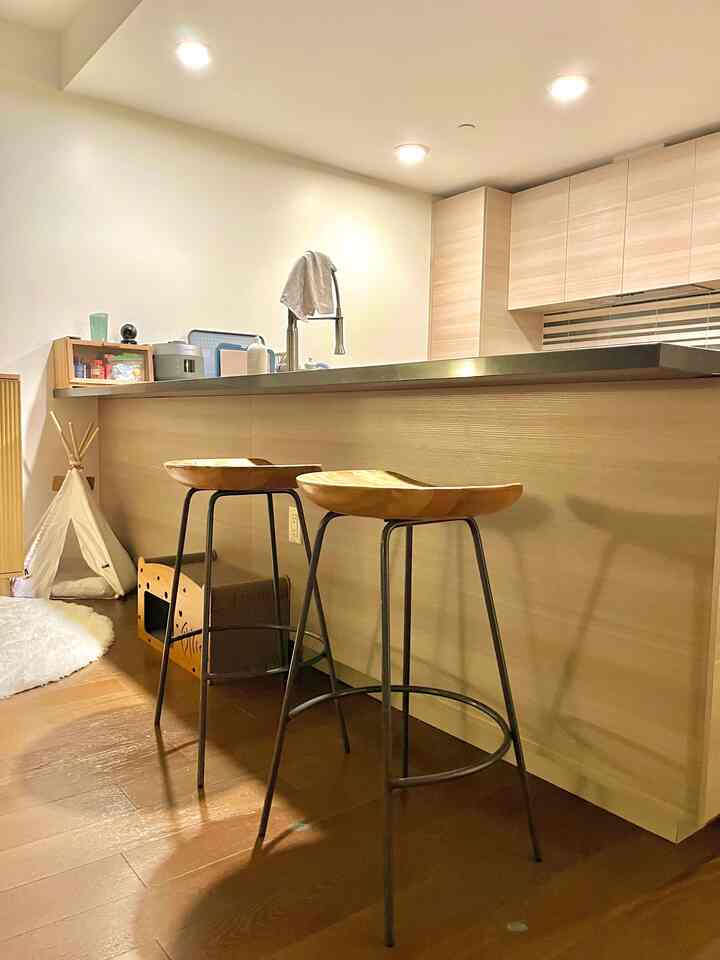 I had these West Elm bar chairs in mind for months — the exact shape, the wooden seat, the dark silver legs — and was hunting for a used pair that would match our kitchen’s tone perfectly. Then one day, like magic, they popped up on Facebook Marketplace just a few blocks away… in perfect condition! ✨
