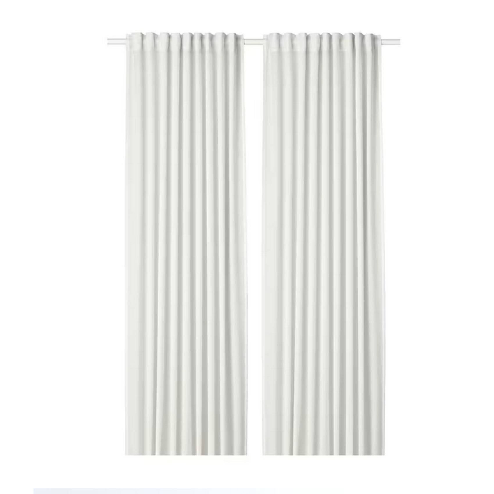 White fine-woven curtains filter sunlight and provide privacy while letting in light. The multi-way header lets you choose from various hanging methods for a versatile look.