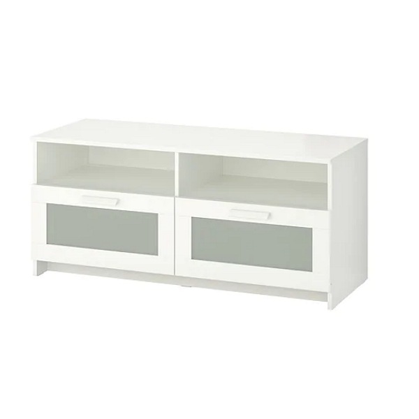 This TV unit features generous drawers for storing remote controls, game controllers, and TV accessories. Built-in cable outlets at the back allow you to organize cords so they remain out of sight yet accessible. The bench is suitable for TVs up to 45 inches wide, or larger as long as their weight does not exceed the 35 lb limit for the top panel. The unit coordinates with other pieces in the BRIMNES series. Take care with the glass top and edges to prevent damage, and securely anchor the TV bench to avoid tipping hazards.