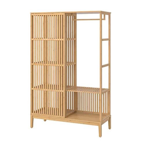 Featuring classic Scandinavian clean lines and a light, open feel, this bamboo wardrobe provides storage for clothing and personal items while serving as a distinctive element in your space. It can be installed as a room divider by mounting one of its short sides to a wall. Designed for both openness and privacy, the wardrobe has a fixed panel on one side and a sliding door on the other, offering easy access to hanging clothes or shelf contents from either side. Shelves are suitable for displaying favorite objects, and the overall design coordinates with other NORDLI and ELVARLI series pieces.