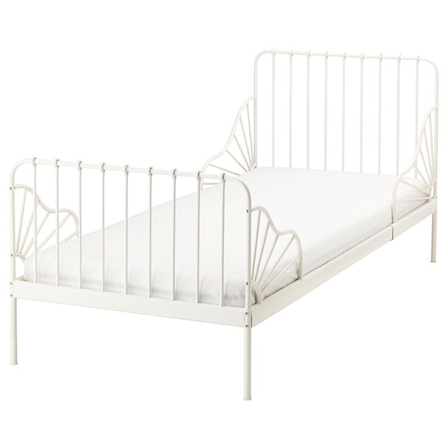 This extendable bed adjusts in length to accommodate your child's growth, providing a practical sleeping solution. It features a slatted bed base, included in the price and packaged separately, and its classic appearance blends easily with a range of furniture styles. Mattress and bedding are sold separately. The bed's static load capacity is designed for sleeping or sitting. For safe use, ensure a proper distance from the wall and avoid attaching hooks or ropes where children could get caught. Designed for compatibility with IKEA frames.