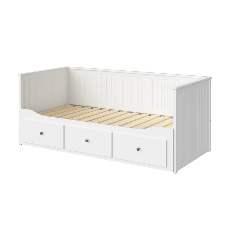 Offering multiple uses, this daybed serves as a sofa, single or double bed, and provides generous storage with built-in drawers. Its high frame and clean design lend a snug, enclosed feeling and fit well with the Hemnes series furniture. The lacquered frame is simple to care for, and the slatted bed base is included. Compatible with two twin mattresses (sold separately), it easily transforms for overnight guests by extending the base to create a double bed. The daybed is not intended for use as two separate single beds, and bedding must be purchased separately.
