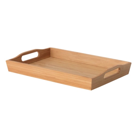 Crafted from durable bamboo, this tray with handles makes carrying and serving food easy, and its raised edge helps prevent spills. Its simple design fits well in any setting.