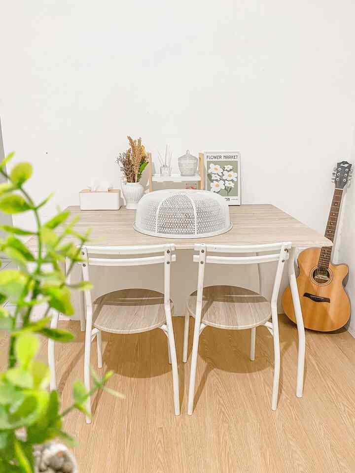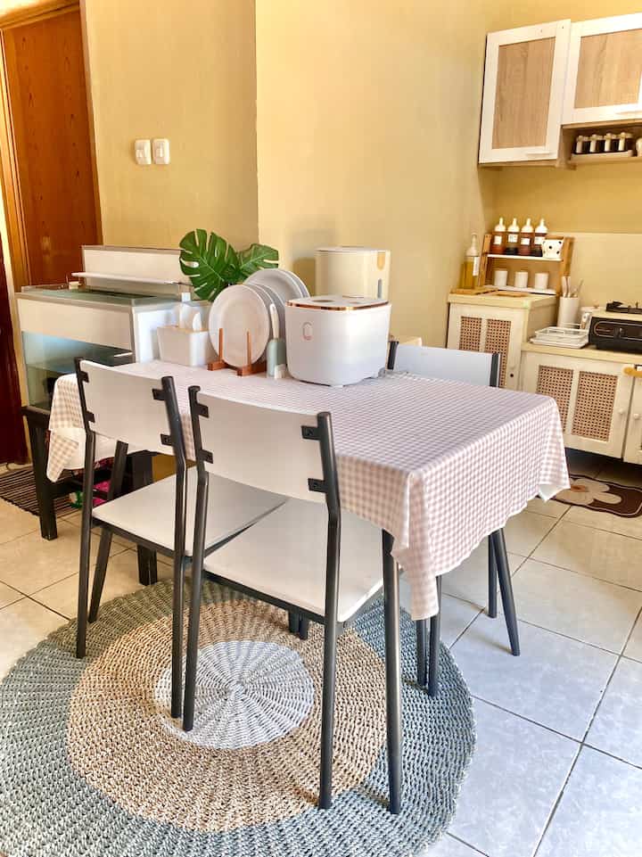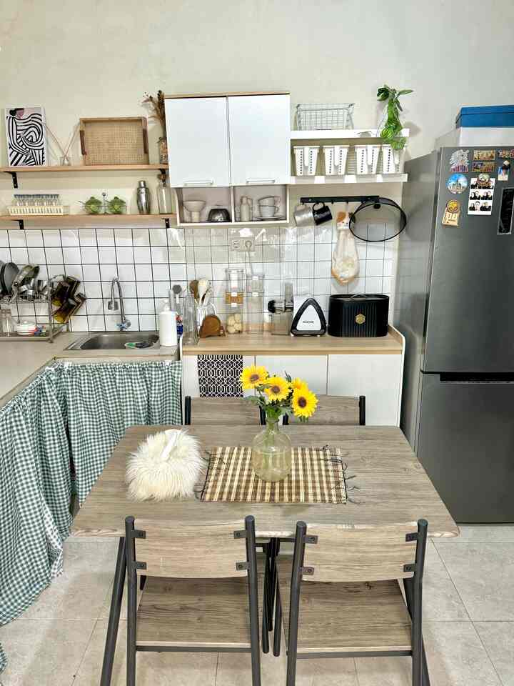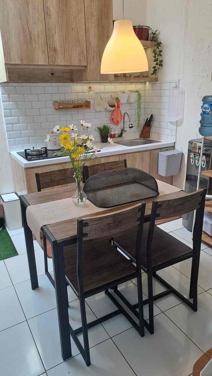 Untuk meja makannya aku sengaja beli yang untuk 4 kursi walau aku cuma tinggal sama pak suami, menurutku ini menjadi siaga juga barangkali ada teman atau keluarga yang datang, penataan meja makan sendiri kami sering ubah, kadang depan dapur kadang juga disamping, bergantung mood hehe suasana nyamannya sih pas kayak gini depan dapur agar aktivitas setelah masak bisa lgsg simpan masakan di meja, begitu juga dekat dengan sink jadi gampang mencuci tangan sebagainya