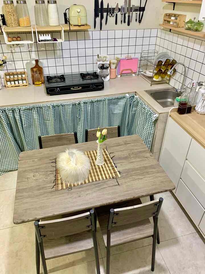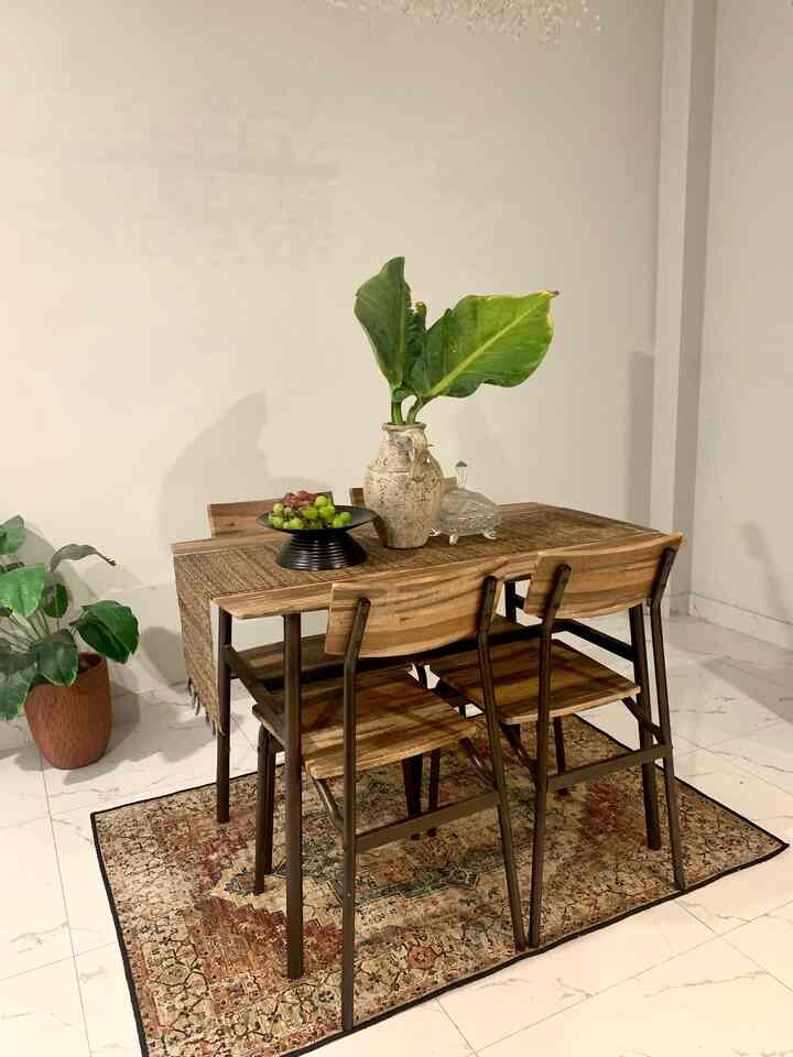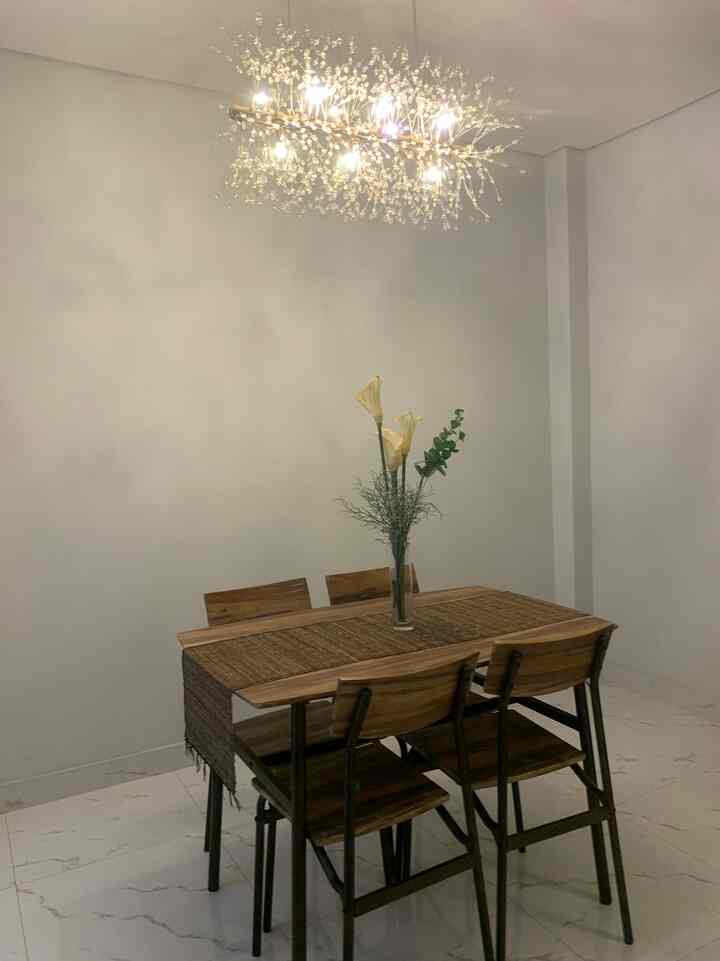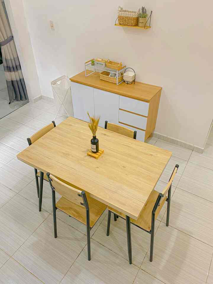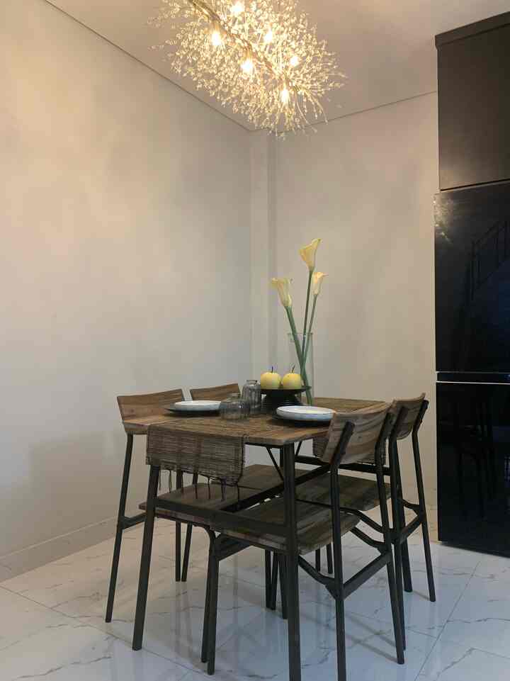 Untuk meja makannya aku sengaja beli yang untuk 4 kursi walau aku cuma tinggal sama pak suami, menurutku ini menjadi siaga juga barangkali ada teman atau keluarga yang datang, penataan meja makan sendiri kami sering ubah, kadang depan dapur kadang juga disamping, bergantung mood hehe suasana nyamannya sih pas kayak gini depan dapur agar aktivitas setelah masak bisa lgsg simpan masakan di meja, begitu juga dekat dengan sink jadi gampang mencuci tangan sebagainya