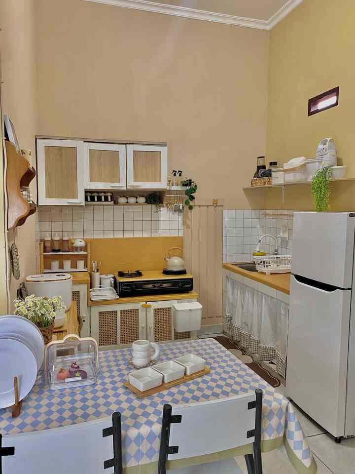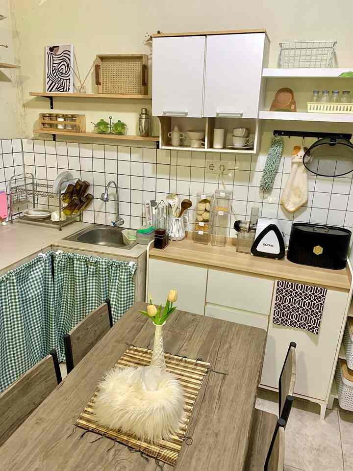 Untuk material yang aku pakai karena berhubung belum menggunakan kitchen set, aku pakai table top dari granit ukuran 60x60, dindingnya sudah bertegel juga tapi karena ada kesalahan saat pemasangan jadi kami akali menggunakan stiker walpaper, untuk penambahan meja dan rak dapur dekat sink itu kami gunakan sebagai dapur kering, didecor sedemikian rupa agar aku dan pak suami lebih gampang dalam penataan perabot dan penyimpanan kebutuhan rumah sih, untuk warna cat dinding kami memilih mengecat warna peach lebih ke cream agar kesan warmnya dapat, suka banget dengan pemilihan warna cream gini lebih masuk ke perabot ☺️