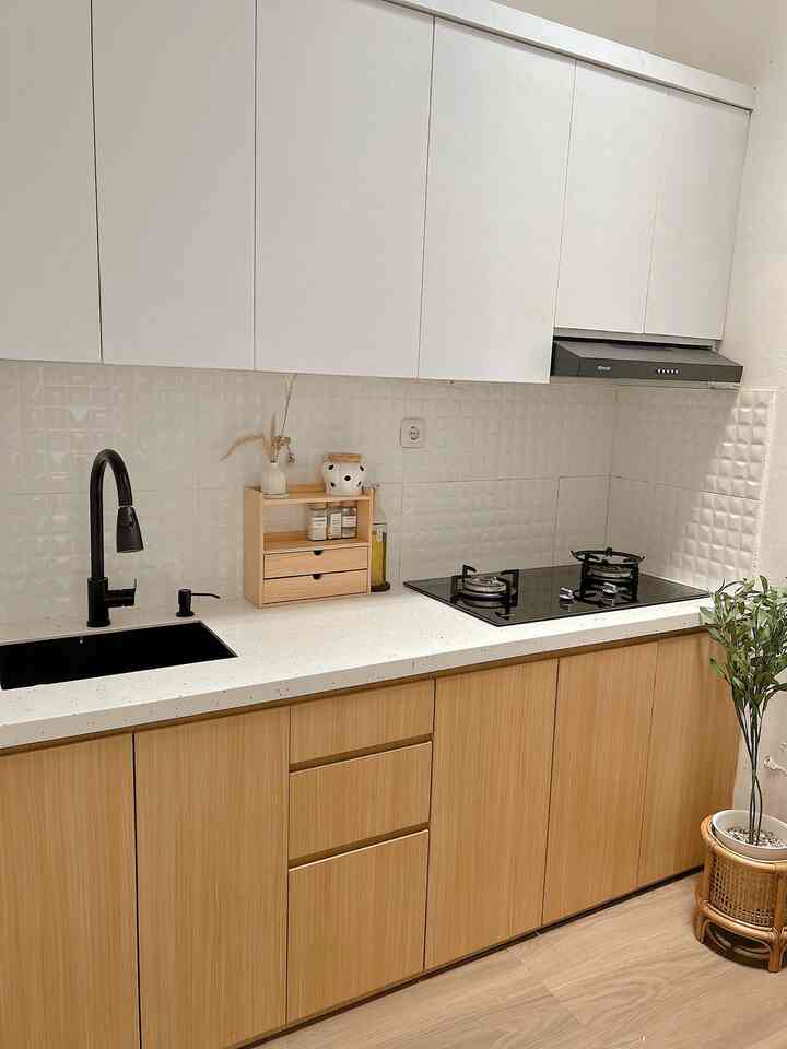sementara backsplash-nya dipilih mozaic pattern agar terlihat lebih klasik dan hangat.