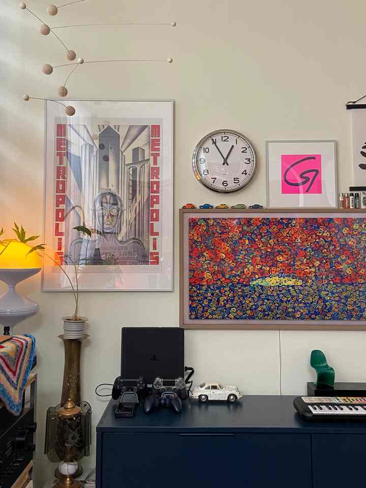 Kami membutuhkan waktu lama untuk menemukan lemari TV yang kami sukai, dan akhirnya kami mendapatkan perangkat angkatan laut ini, yang benar-benar mencerminkan era tersebut. Kami menyukai betapa indahnya ikatan ini dengan bagian rumah lainnya. Kami juga menggunakan lantai kayu dengan warna sedang untuk memberikan suasana hangat dan warna netral terhadap semua warna 🔴🔵🟡