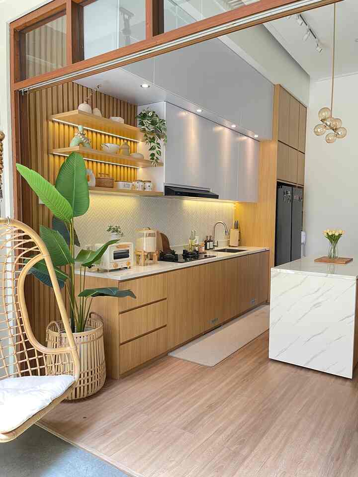Kami memilih tema japandi, karena memberikan kesan hangat dan nyaman. Kami juga menambahkan beberapa barang dekorasi, agar dapur terlihat lebih menarik. Seperti tanaman artificial di sudut ruangan dan vas-vas dengan berbagai bentuk pada ambalan kitchen set.