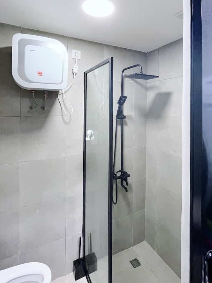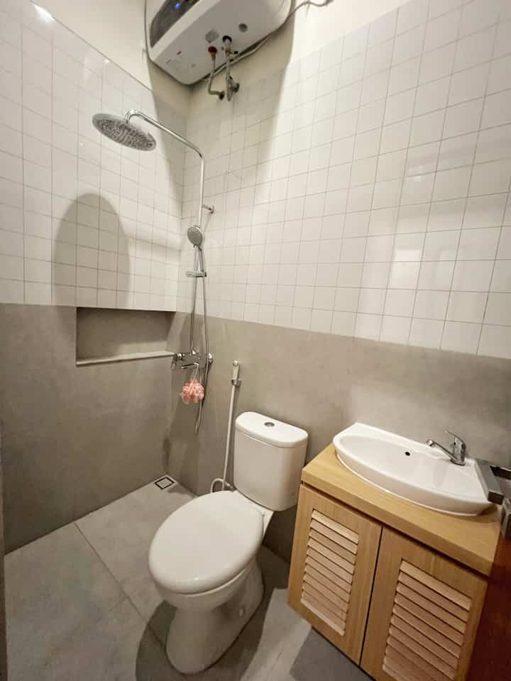 Lalu utk rice cooker berada di atas meja galon air minum yg posisinya ada di sebelah kanan meja makan. Meja ini terdapat roda sehingga bisa ditarik ketika mengambil air minum. Kemudian di dinding atasnya saya tambahkan wall board shelf utk gantungan lap handuk dan storage kecil.