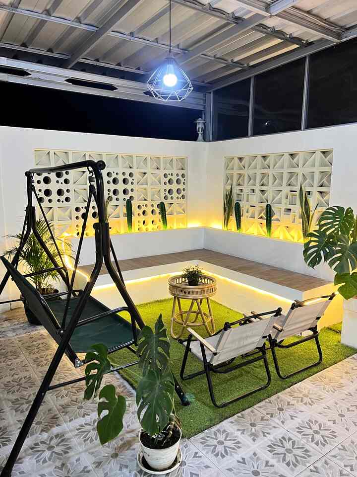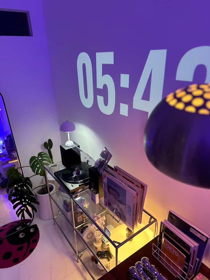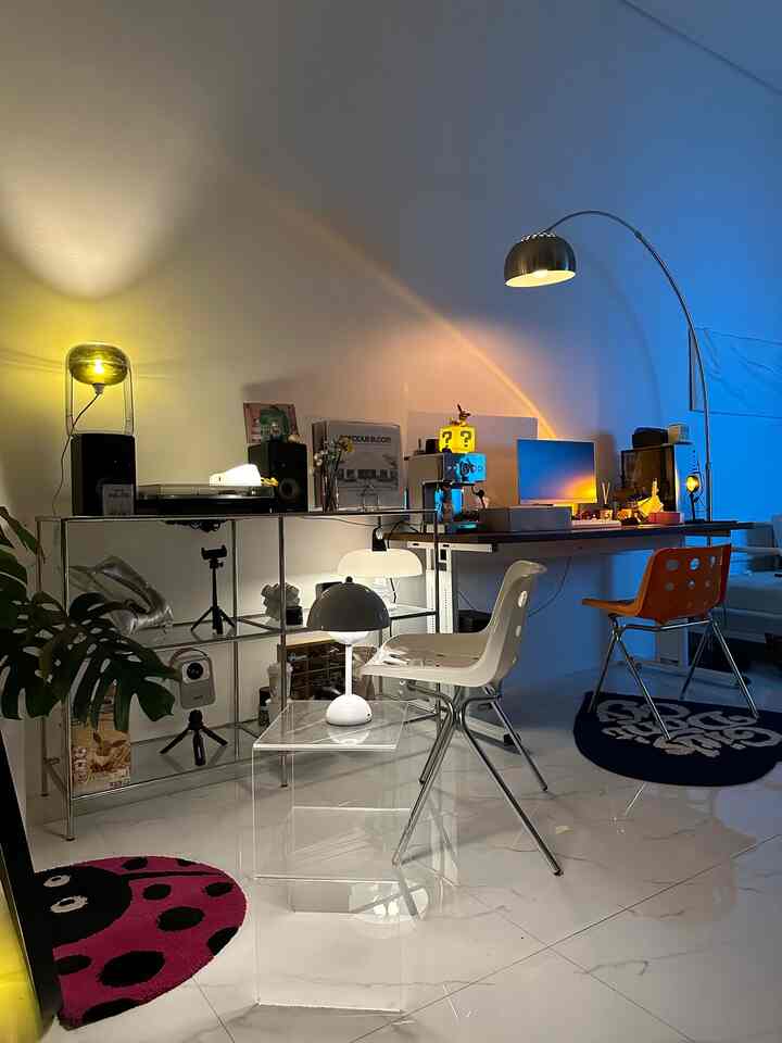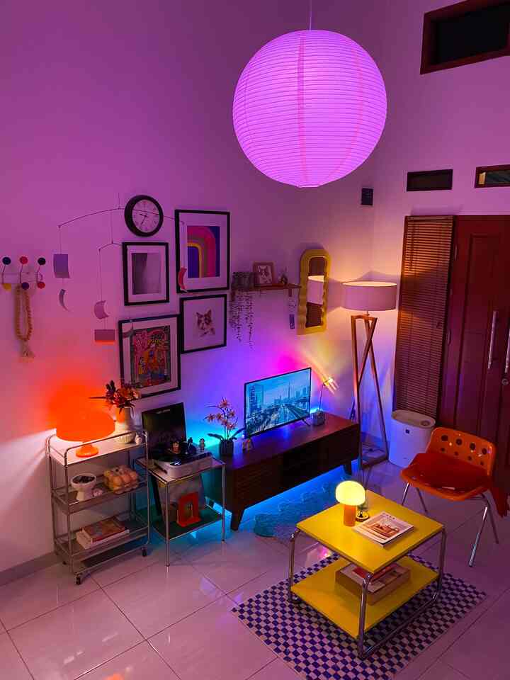 Meromantisasi living room berkonsep mid-century modern dengan efek visual neon berkat lighting by mood ✨