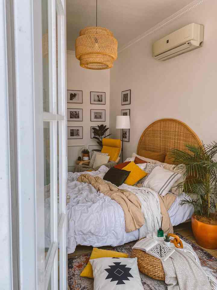 elemen dekorasi yang menonjolkan style ini adalah headboard rotan berbentuk arch dan juga kursi berlengan warna kuning, berpadu dengan deretan cushion motif boho dan abstract rugs yang memiliki kombinasi beberapa vibrant colors