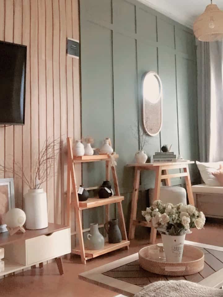 Lalu utk rice cooker berada di atas meja galon air minum yg posisinya ada di sebelah kanan meja makan. Meja ini terdapat roda sehingga bisa ditarik ketika mengambil air minum. Kemudian di dinding atasnya saya tambahkan wall board shelf utk gantungan lap handuk dan storage kecil.