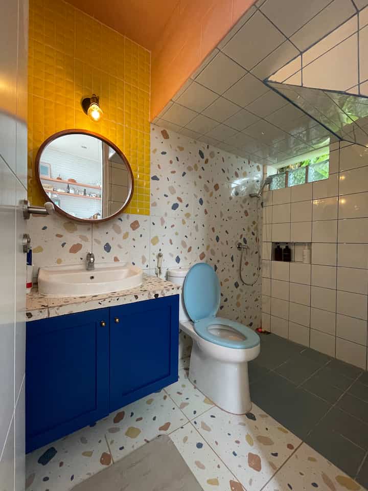 Selain partisi, saya mendekorasi area kering dengan keramik back splash wastafel berwarna kuning mustard agar ruangan terkesan lebih fresh dan tidak pucat, juga menambahkan rak sabun dekat shower menggunakan keramik ini. Lalu ditambah dengah tirai shower motif ikan biru untuk pemisah shower dan kloset.