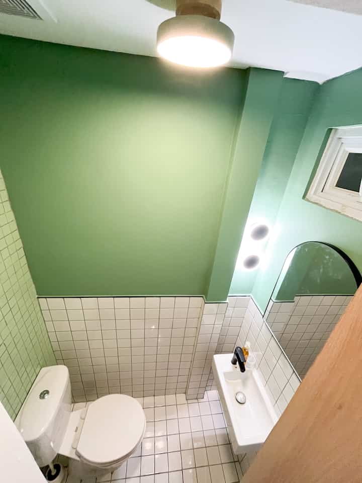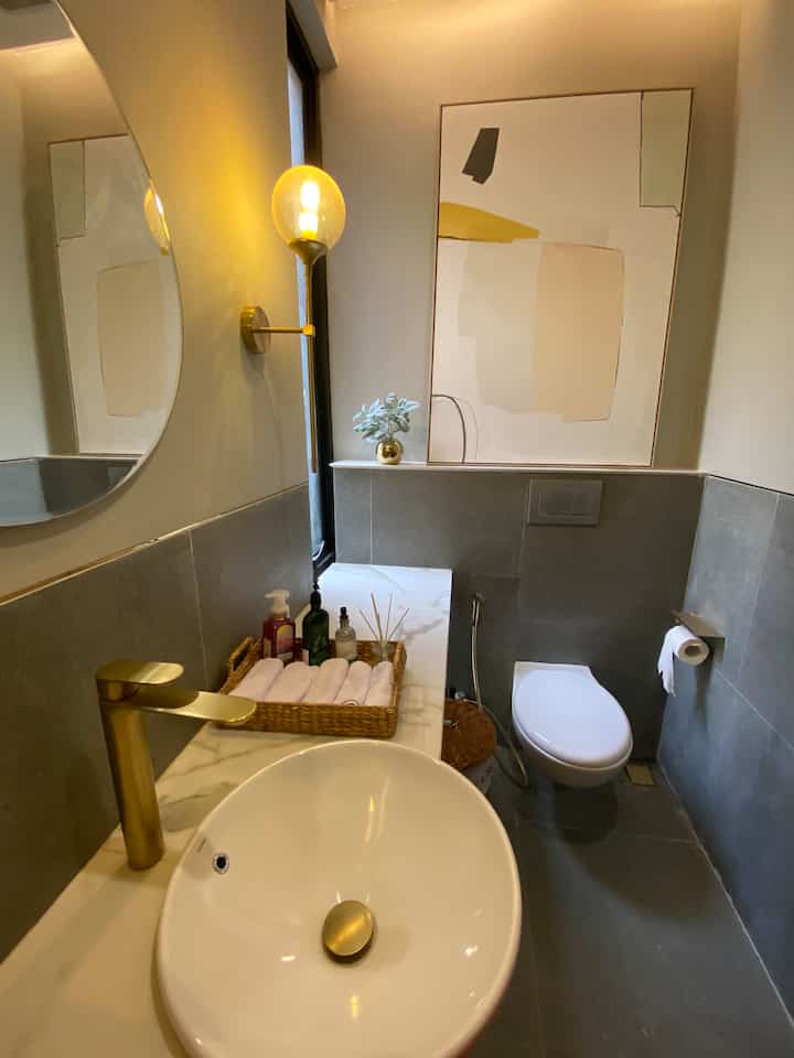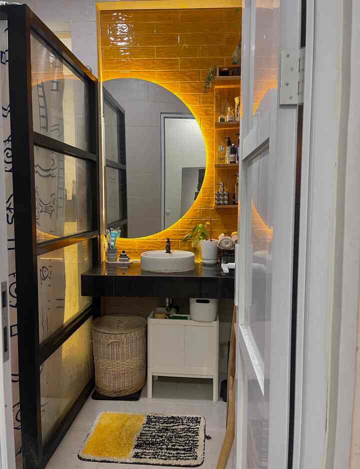Cermin setengah bulat yg unik agar efek looksnya tampak seperti half moon dengan lampu ambience led strip, Rak dinding susun kayu untuk tempat stock sabun & body skincare. tambahan kabinet waterproof di bawah wastafel dari ikea yg fungsional banget untuk penyimpanan alat kebersihan.