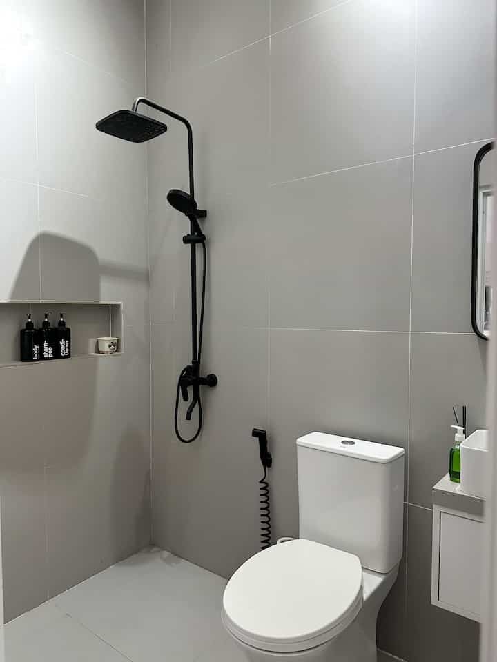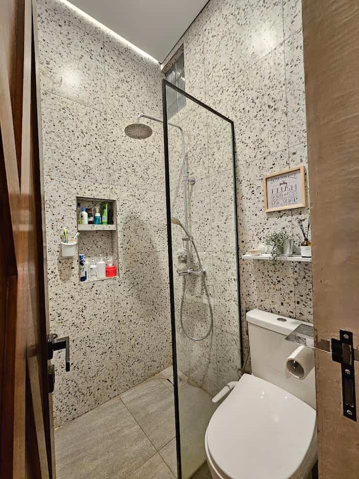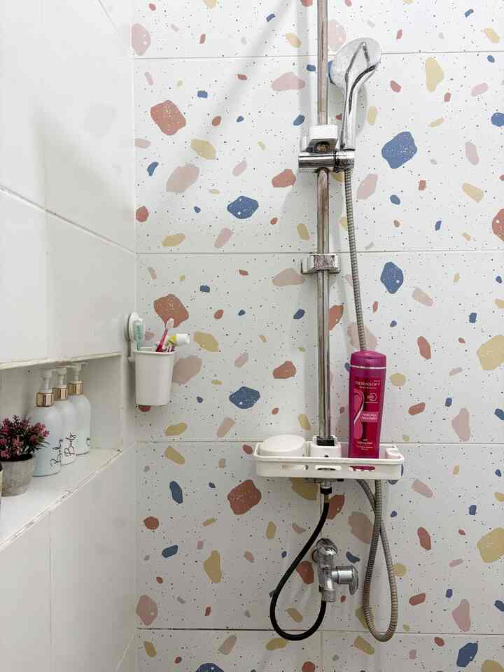 Sedangkan utk shower mandi, jet shower, kloset, Keramik dinding abu dan lantai keramik motif terazo adalah bawaan developer.