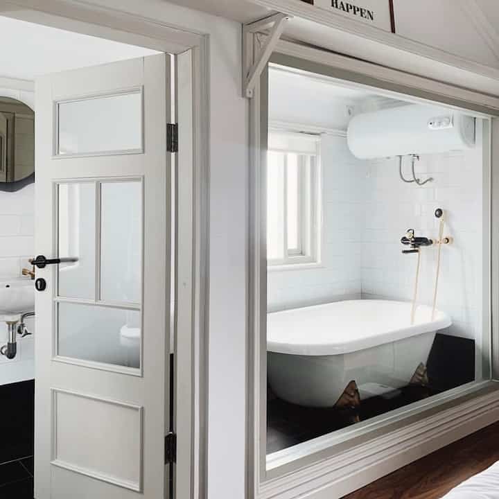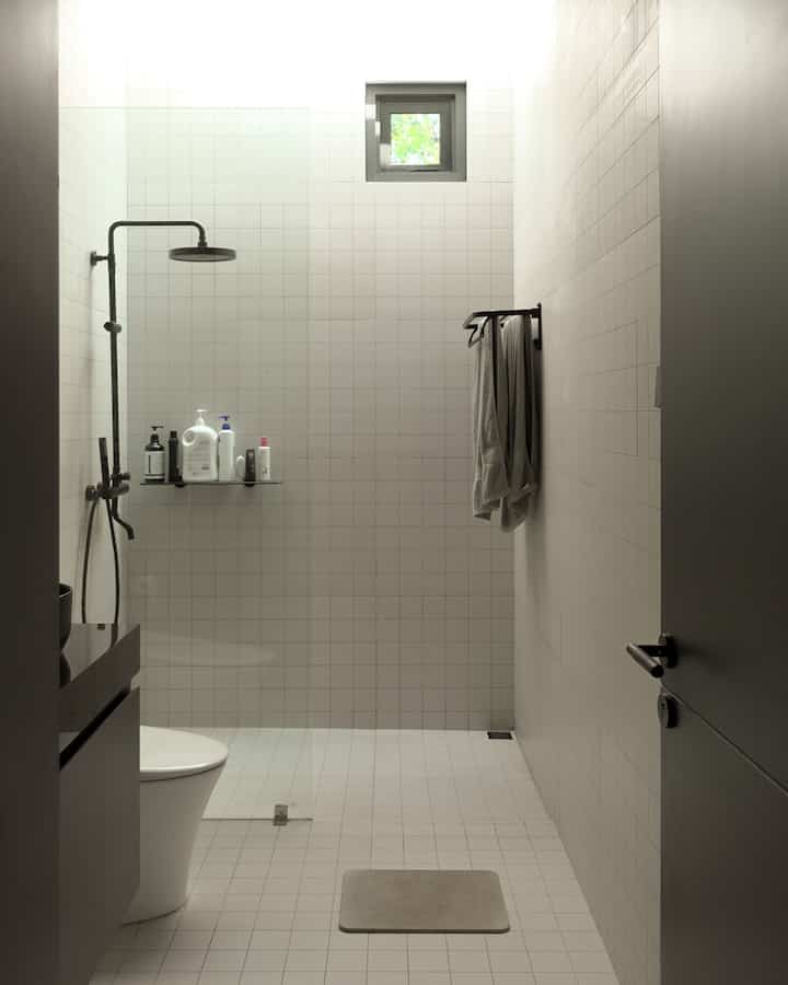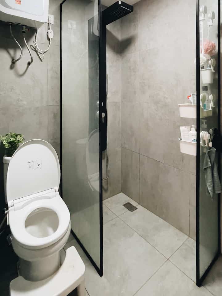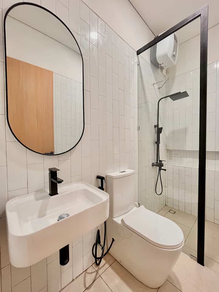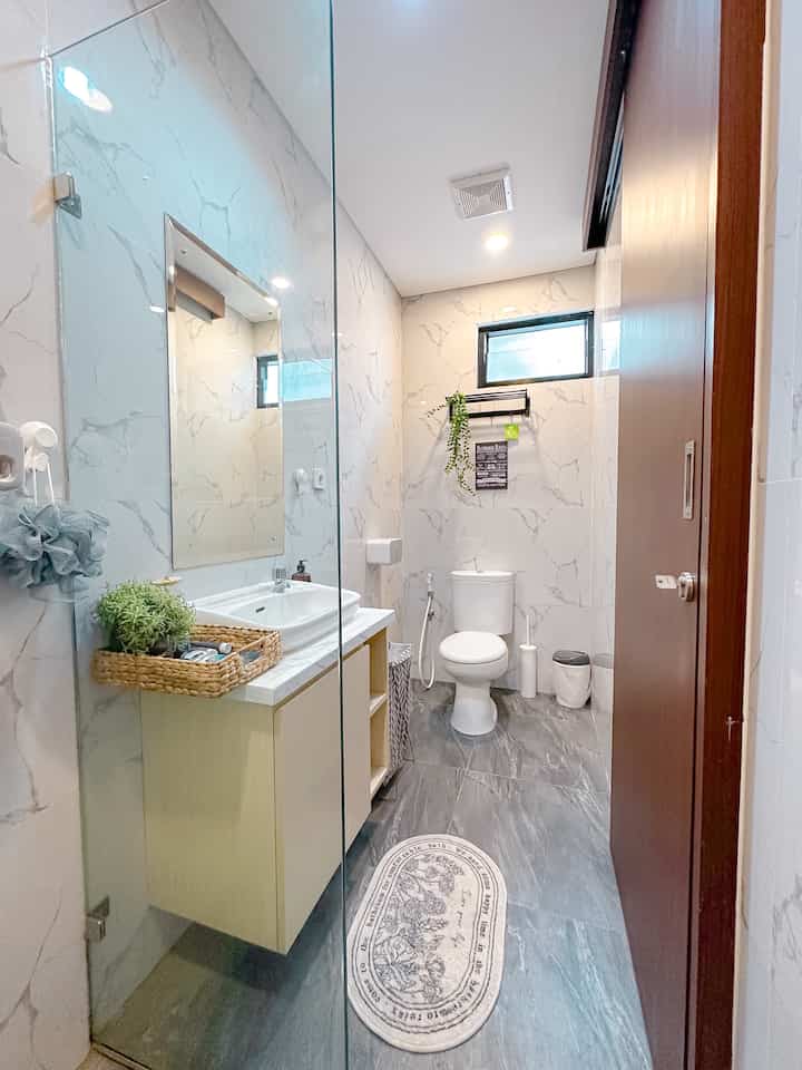 Kamar Mandi dengan luas 2,2 x 1,7meter ini berada di lantai 2. Untuk kebutuhan kami sehari hari ukuran tsb sudah cukup luas mengingat ruangan ini tidak kami renov masih bawaan developer. Sehingga masih cukup untuk kami tambahkan partisi kaca & aluminium sebagai pemisah area basah & kering (wastafel). Walaupun kurang puas dengan hasil partisi dari vendor ini yg dirasa terlalu tebal. Warna hitam jg sengaja dipilih supaya senada dengan keramik wastafel dari developer. Semoga kalau ada rejeki lagi bisa ganti yg lebih sesuai selera 😊
