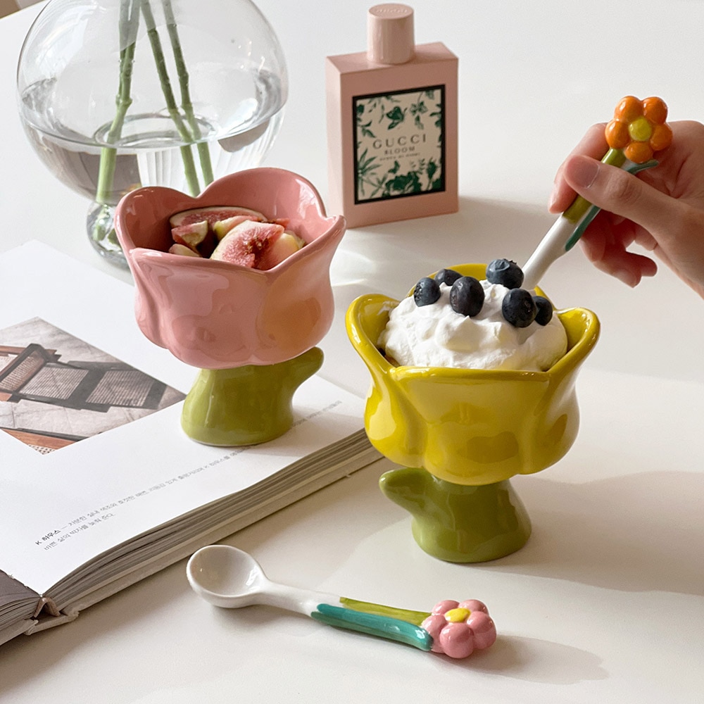 로맨틱 튤립 아포가토컵+꽃 도자기 티스푼세트 요거트컵 아이스크림볼 세라믹