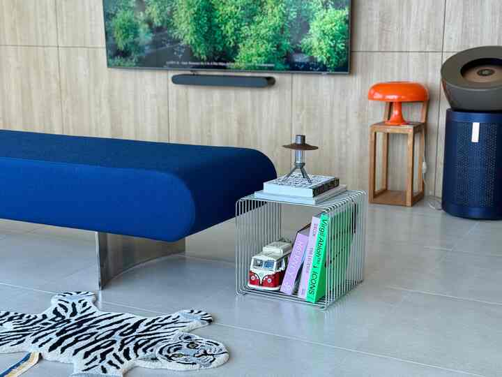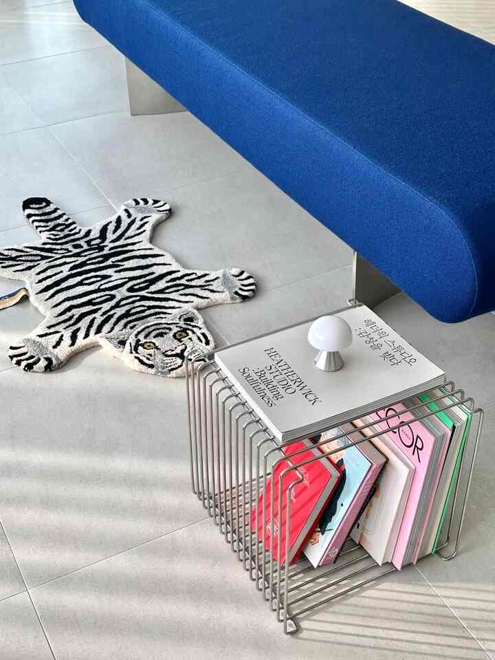 イエローとブルーのストライプ柄カーテンで、光が差し込むとふんわりと色が透けて、とっても綺麗なんです。2. howseaとOFF HOURのクッション