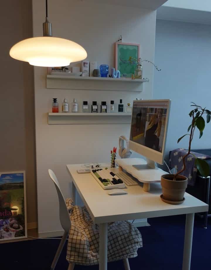 デスクの横には無印の賃貸でも取り付け可能な棚を取り付けて、香水やお気に入りのものたちを並べています。お気に入りのスペースです。