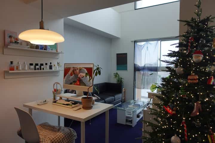 ソファはル・コルビジェLC2のリプロダクト品です。スチールフレームがかっこよくて一目惚れして購入しました。いえ、正しくは旦那さまに買っていただきました(笑)。旦那さまありがとう。3人掛けなので広々としていて使いやすく、身長150cmの私は寝転ぶと座面にちょうどおさまります。お昼寝にもぴったり。アーティフィシャルレザーなので汚れも気にならず、お手入れしやすいのもポイントです。クリスマスツリー