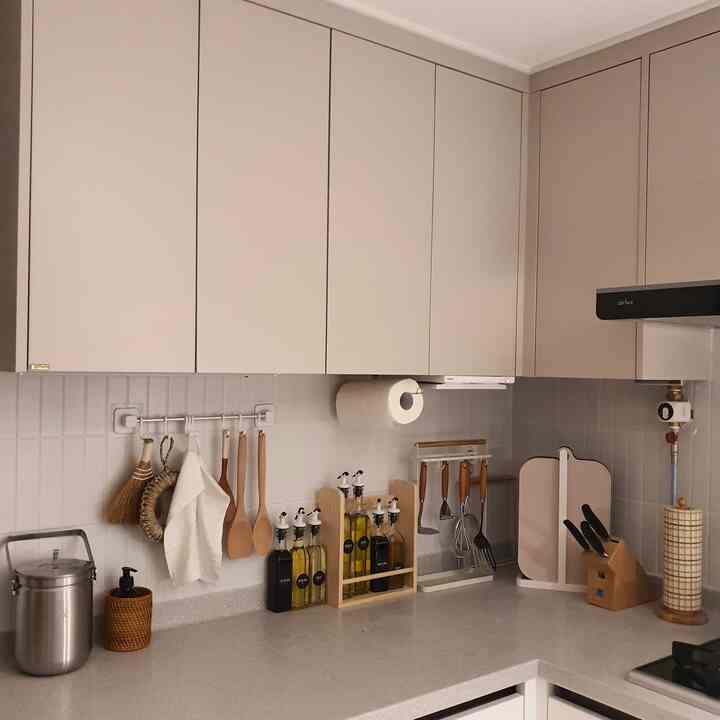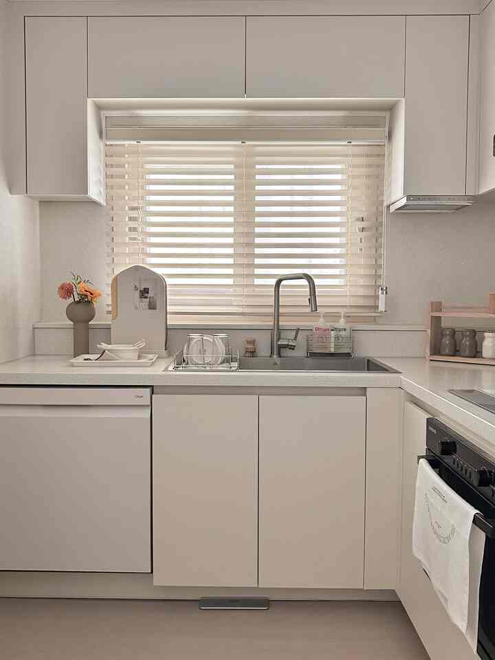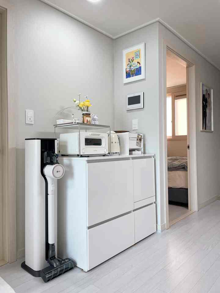 幸せ住宅36型キッチン。トイレとバンサイのスペース 狭所で食卓を置くには一室カフェ場しかありませんでした。 オーブンや炊飯器が見えず、もう少し収納ができる シートを探している間、フィルウェル長はぴったりだと思ったので購入しました。 その結果、とても満足しています!!🫶🏻 使用しないときは見えないので家がより綺麗に見え、使用時に開閉するのも不便ではなくて幸せ住宅36型キッチンスペースお悩みの方におすすめです! #행복주택인테리어 #행복주택36형인테리어 #신혼집 #신혼집꾸미기 #거실 #거실인테리어