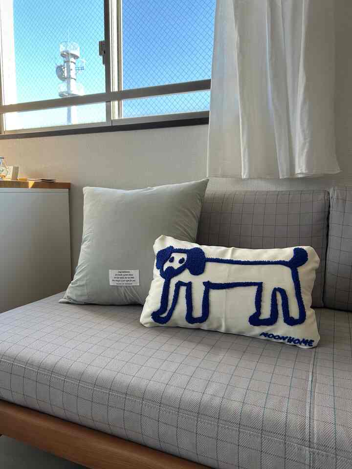 新しいクッションカバー2つ どちらもohouseで購入しました。 ラッピングも可愛くてときめきます… 🐶はふわふわ立体素材で触り心地もよい。 緑のクッションは、ブルーも買って気分で着せ替えたい… セットのストライプも追加したら絶対かわいい #Ohouseshopping #クッション