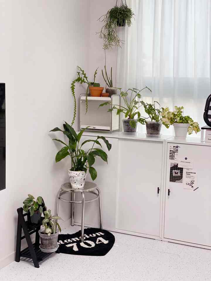スパティフィラムが植えてあるテラゾーの植木鉢も私がペイントしてアレンジしたものです。その横にあるガーデンラックも元々ウッドカラーだったものをブラックに塗り替えました。