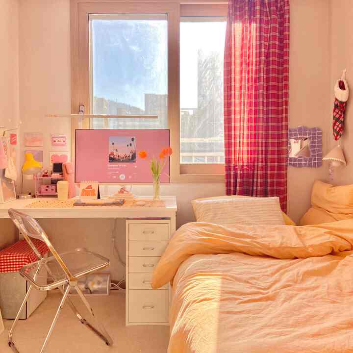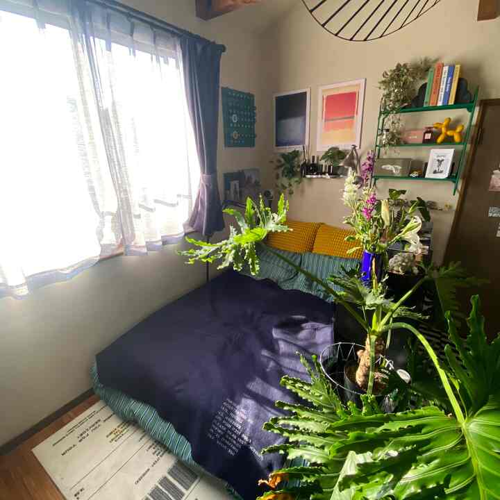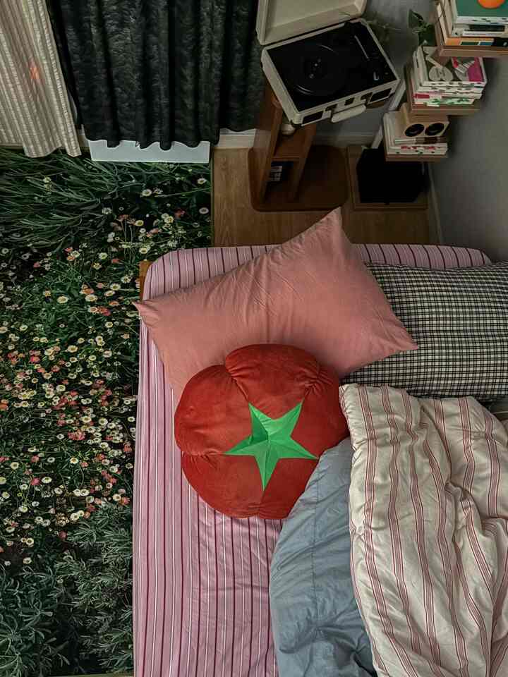 春らしく模様替えしたベッド周り。春っぽいピンクのマットレスカバーに替えてみました。そして、たまたま出会ったトマトクッションは、一目惚れで即購入。かわいすぎて、今でも一番のお気に入りです🍅💗窓にはカーテンを2枚付けました。どっちにするか決めきれず、結果半分ずつに(笑)。ベッド側は睡眠の邪魔にならない暗めのシフォンカーテン、もう半分は光が入るように明るいカーテンを選びました。現在:グリーンのソファベッドが主役