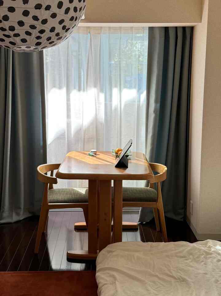 最初はベッドを窓際に配置してたんですが、カーテンを閉めても日が入ってくるので、週末も眩しくて8時には目が覚めてしまい、結局今のレイアウトに変えました。おかげで週末はお昼頃までぐっすり寝ています。