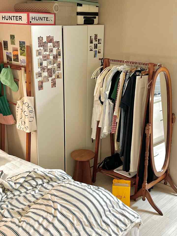 服の収納には幅110cmのワードローブをオーダーしました。「もう少し大きいサイズでもよかったかな」とも思いますが、ベッド横に程よく収まり、今のところ問題なく使えています。価格のわりにしっかりしていて耐久性も満足です。真っ白な扉が少し味気なかったので、ヴィンテージ風のポストカードをペタペタと貼ってみました。バランスを考えず自由に貼ったものの、かえってラフな味わいが出て気に入っています。