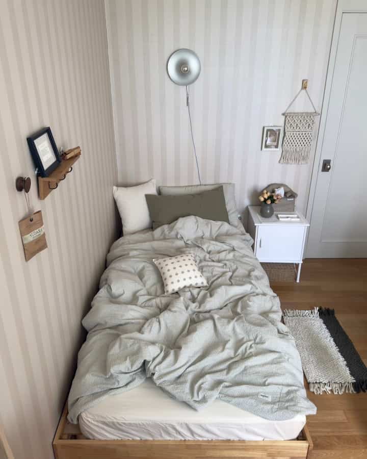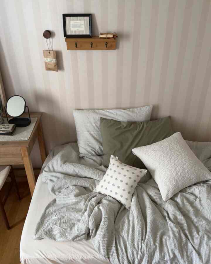 次に寝室です。布団シーツが水色からライトグレーのストライプに変わりました。明るい色のシーツは開放感をくれるんです。