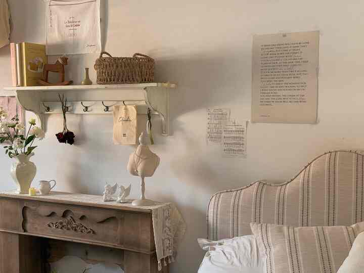 最初は、フレンチテイストのマントルピースにスツール、アイボリーの寝具を合わせました。白い壁にはポスターを飾って、のっぺり感を解消。ほんのり素朴なカントリー感もプラスされて、理想のフレンチスタイルの完成です!