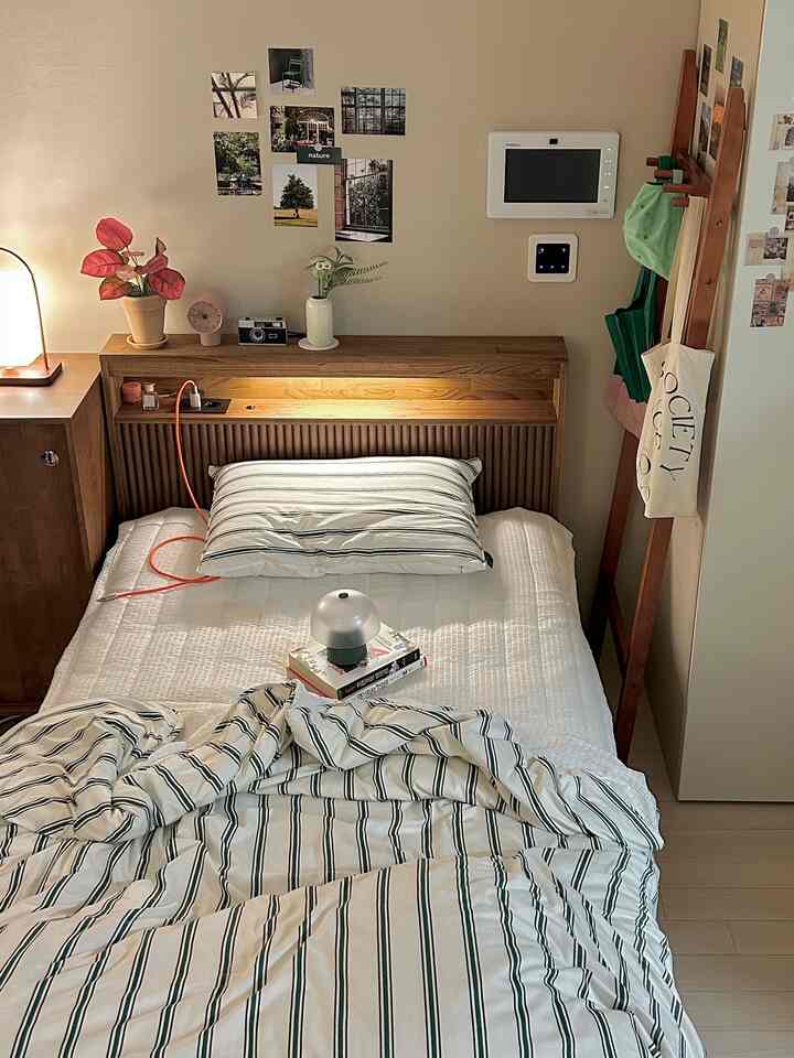 ベッドも部屋の雰囲気に合わせて木製のものに新しく買い替えました。先ほど本棚スペースでご紹介したGORI STUDIOのランプを購入して以来、カーキ&オリーブ色がマイブームで、ベッドまわりにもその色をアクセントカラーとして取り入れています。