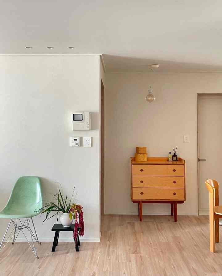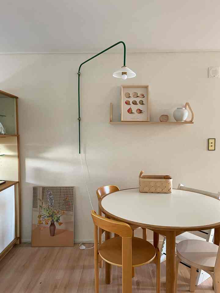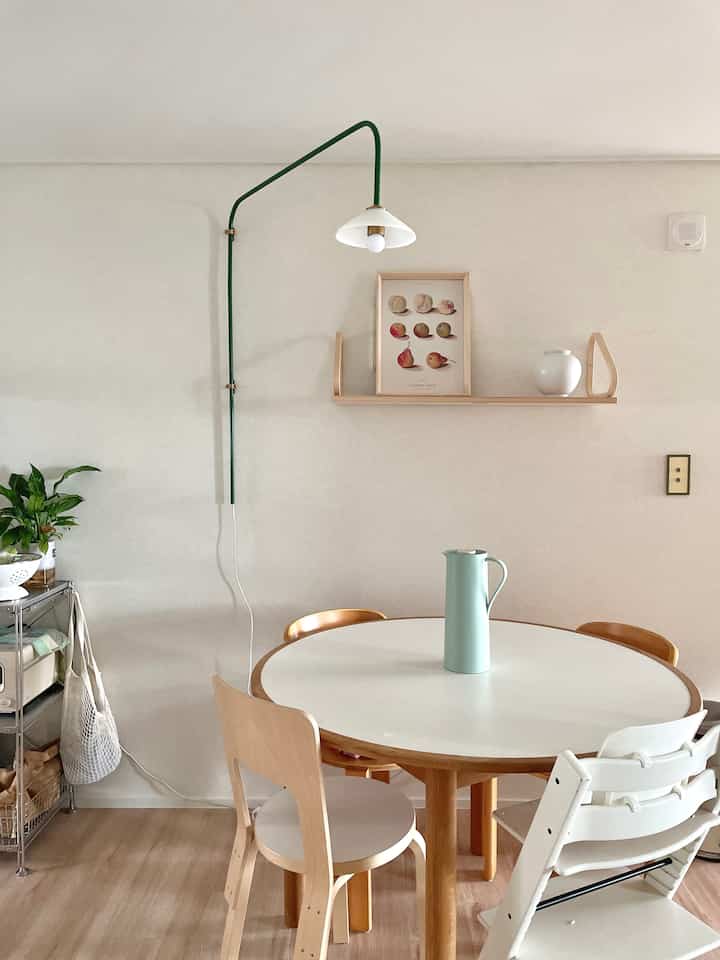 キッチンはポイントになる小物と家具を配置してみました。ウォールライトとずっと欲しかったArtekのウォールシェルフで壁の余白を埋めています。
