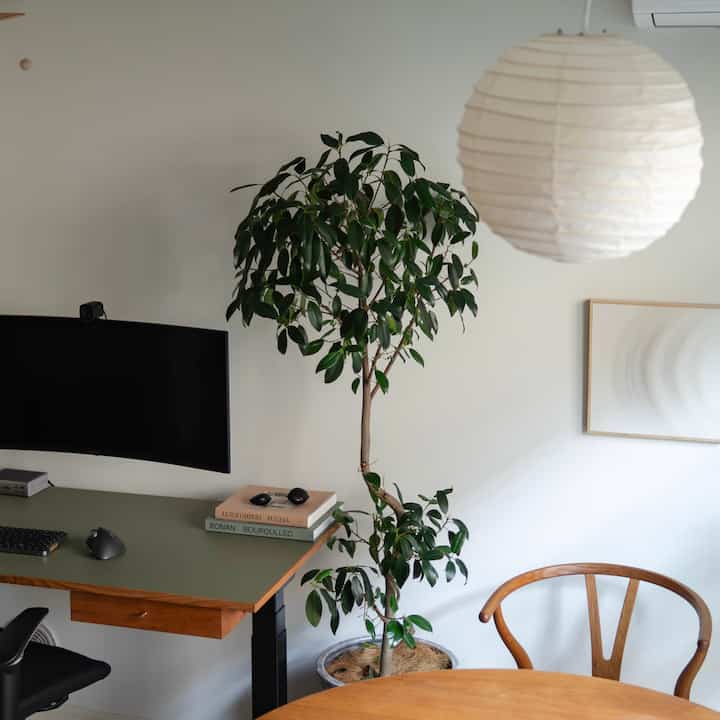 ワークデスクの天板を決めるときに最初は、無垢の一枚板とかを買って組み立てる気満々だったんですが、改めて考えると今の部屋のバランス的に木の面積多くなすぎるな🤔と悩んでいました。 で、他の素材何かあるかなと考えたときに出てきたのがリノリウムで、北欧ぽい雰囲気もあっていいなぁと☁️ 半年近く使用してますが手入れもしやすく、このニュアンスのオリーブカラーがあることで柔らかい雰囲気にもなり、リノリウムにして良かったと思います😌 木が好きなのでつい惹かれてしまいがちですが、バランスって大事ですね。笑 #ワークデスク