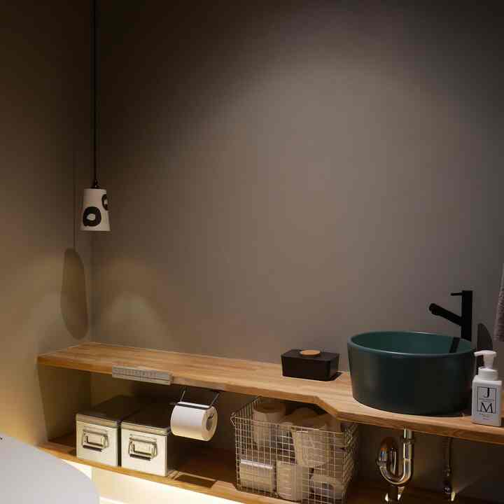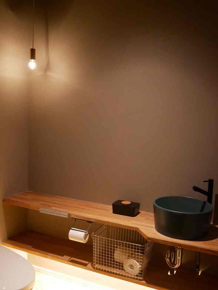 照明は、鏡の背面にオレンジ色の間接照明を仕込んで、頭上には白色のスポットライトを採用することで、時と場合によって色々な使い方や見え方になります💡💡
