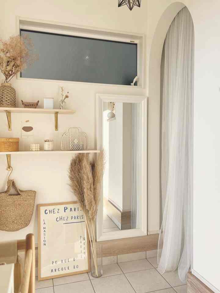 我が家の玄関です 🪞 最近姿見を取り付けて全身が見れるようになりました🤎 飾り棚はDIYであとからとりつけたものです🔨⸝⸝