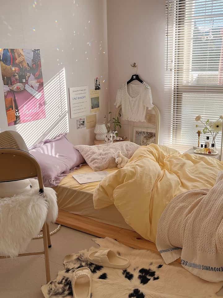 天気がいい日のベッドルーム🌤🫧 イエローのシーツは少し冒険だったけど お部屋も気分も朝から明るくなる気がして お気に入りꕀ꙳🧈 あと違う色との組み合わせを考えるのも楽しい🫶🏻