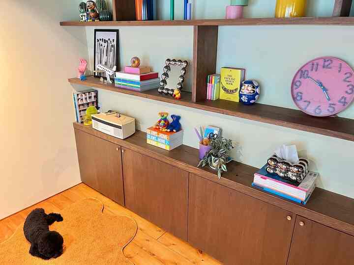 リビングの飾り棚✨ ラグはohouseのショッピングで購入しました🙌 サニーのお気に入り🐶🫶 #リビング #リビング本棚 #ディスプレイラック #リビング本棚 #リビング小物 #リビング収納 #リビング雑貨 #リビングインテリア #ディスプレイ #カラフル #カラフルインテリア #カラフルなインテリア #ミッドセンチュリー #リノベーション #リノベーション
