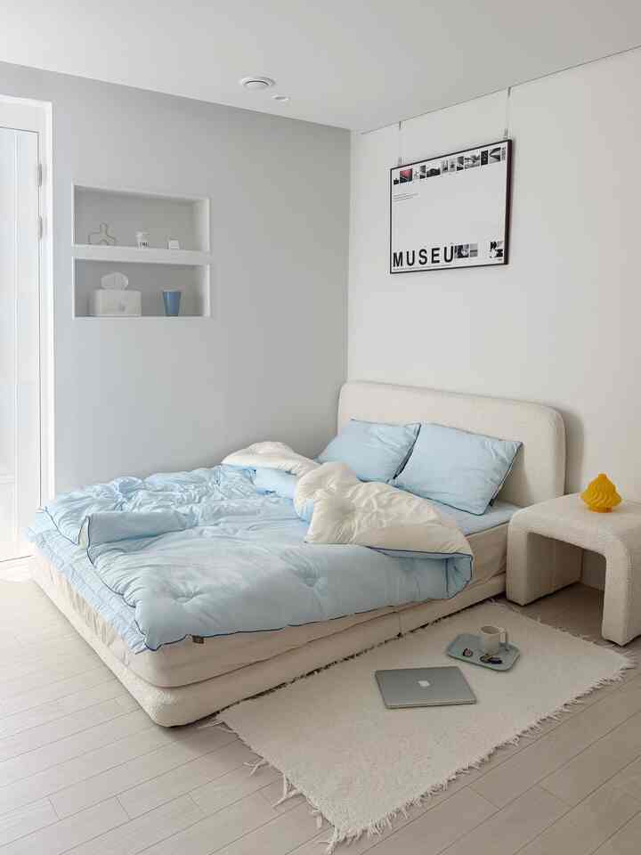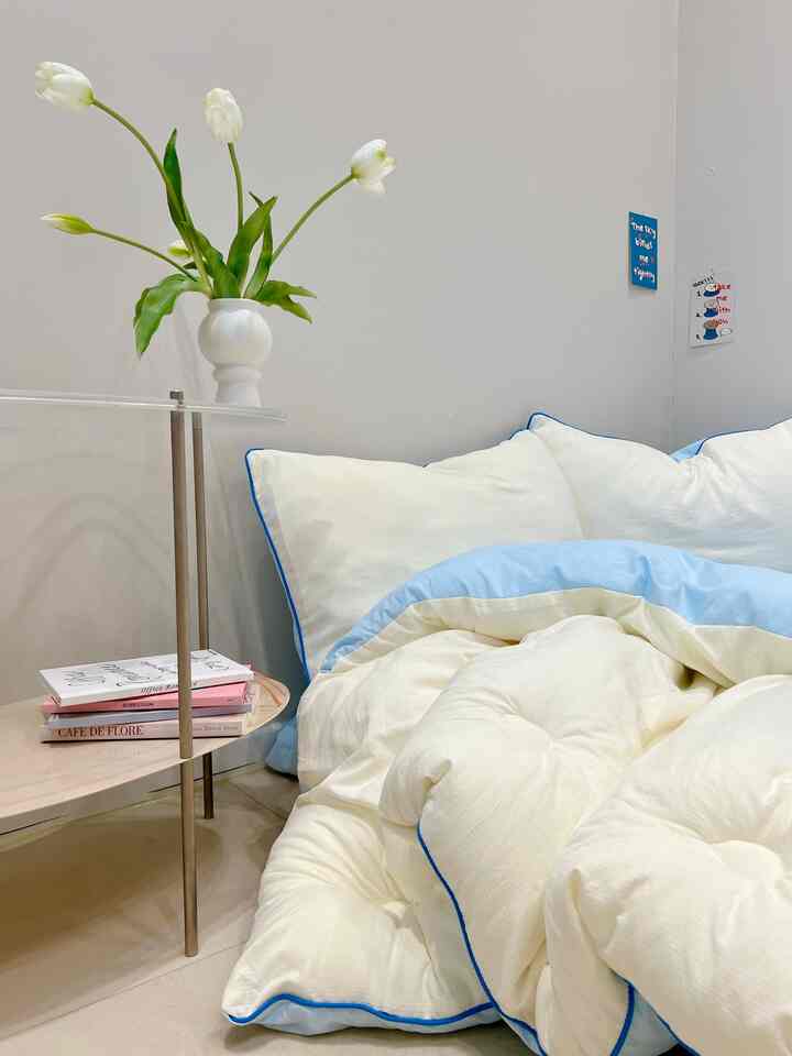 暖かいアイボリーカラーと清涼感のあるスカイカラーリバーシブルで両面で使えるベディングが寝室ムードを豊かにしてくれます。