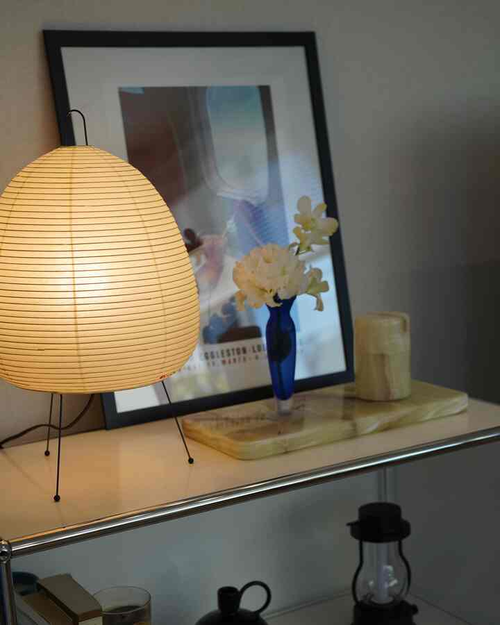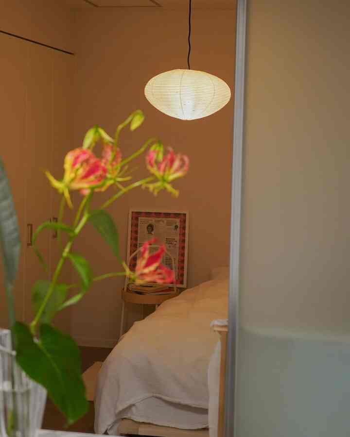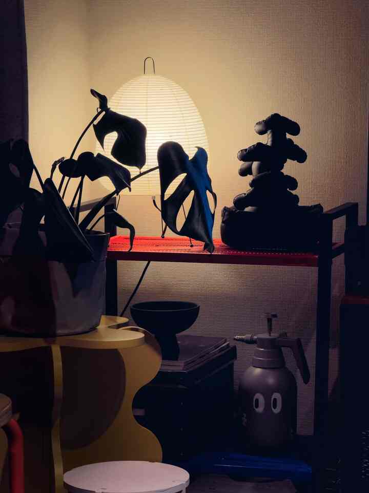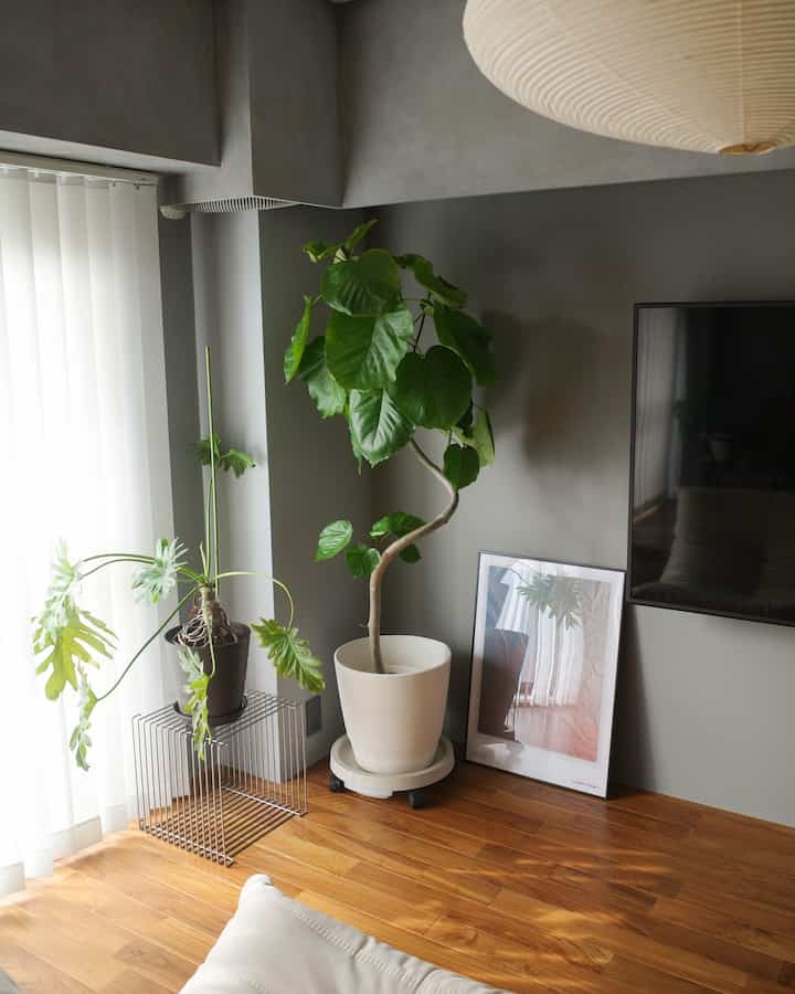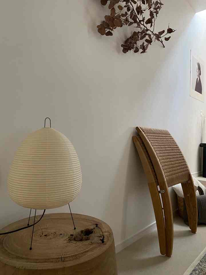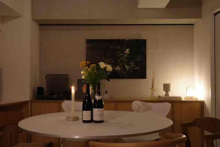 中央には、Fritz HansenのA825ラウンドテーブル。そこに、Carl Hansen & SønのYチェアと、Artekのスツール60、そして卓上のグリーンを添えて、やさしい温もりとリズムをプラスしています。